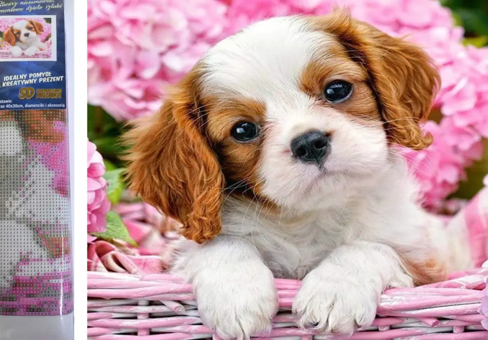 Puzzle Diamant painting: Cachorrinho em cesta rosa 30x40cm