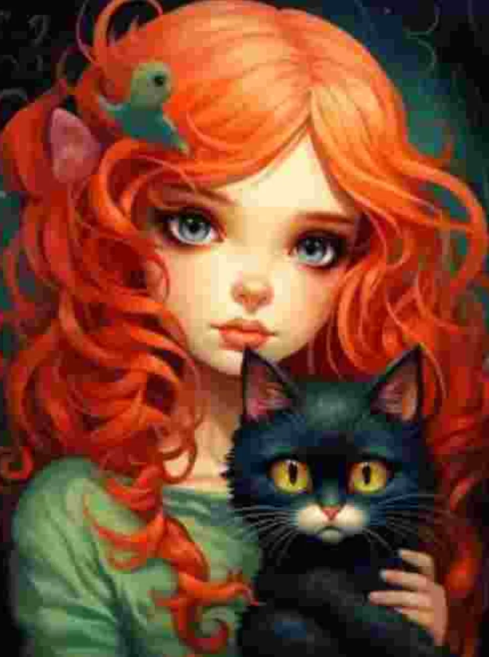 Puzzle Pintura Diamant: Ruiva com um gato preto 30x40cm